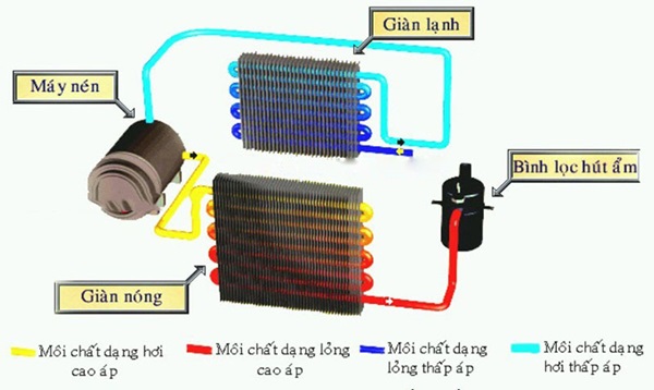 • Máy nén: Nguyên lý hoạt động của máy nén cũng tương tự với chiếc máy bơm chuyên dụng. Nó đảm nhiệm vai trò tuần hoàn môi chất trong hệ thống làm lạnh. Chuyển môi chất từ dạng khí sang dạng lỏng, đồng thời tăng áp suất nhằm đưa môi chất vào dàn nóng.